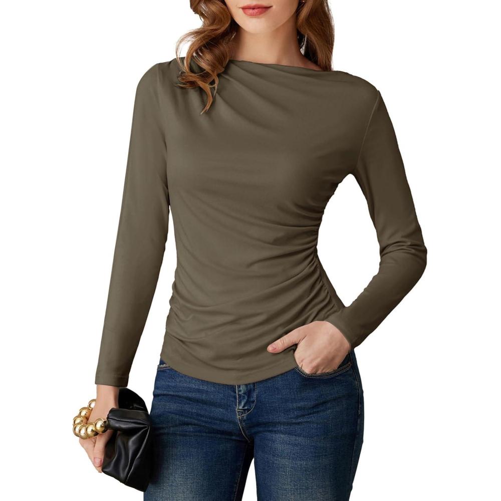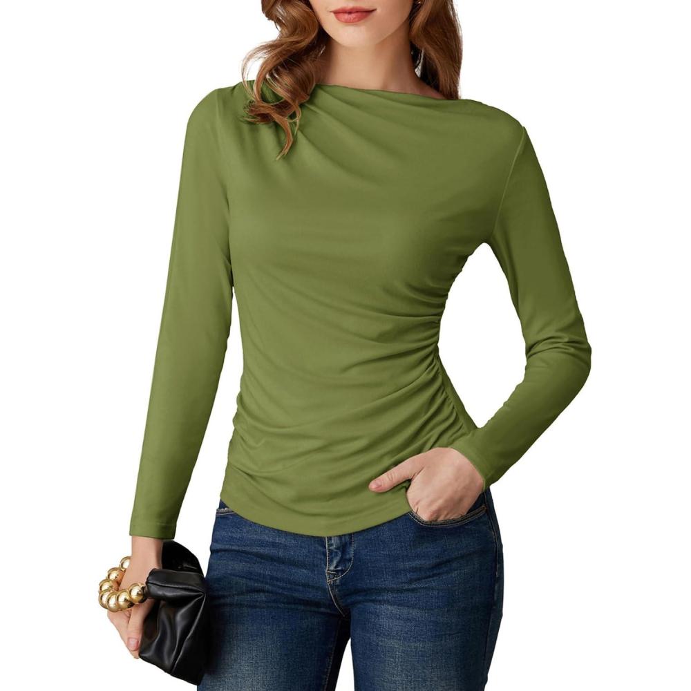 GRACE KARIN 2026 Women’s Long Sleeve Wrap Blouse – Boat Neck Ruched Fitted Trendy Top for Fall Dressy Casual(Army Green)