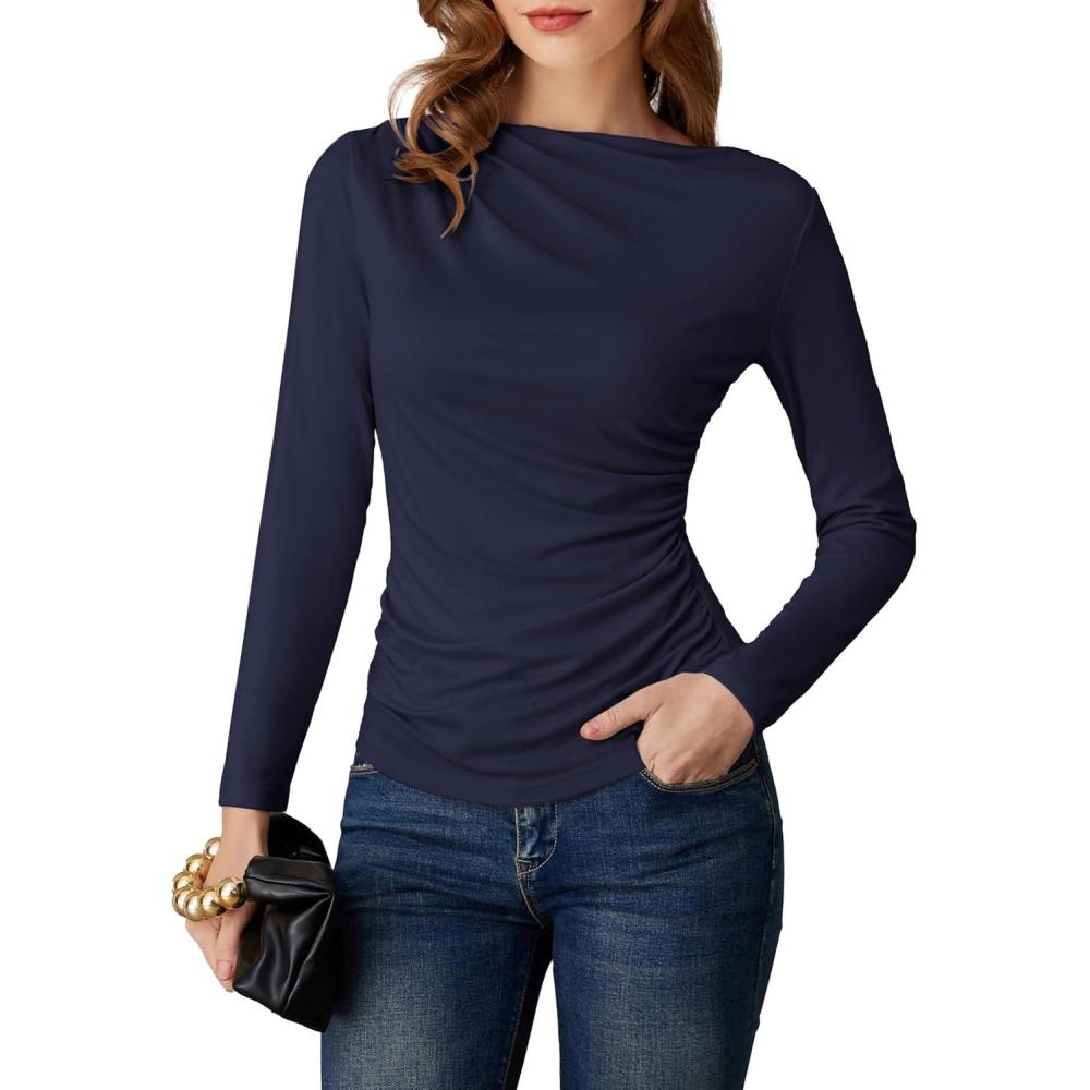 GRACE KARIN 2026 Women’s Long Sleeve Wrap Blouse – Boat Neck Ruched Fitted Trendy Top for Fall Dressy Casual(Dark Blue)