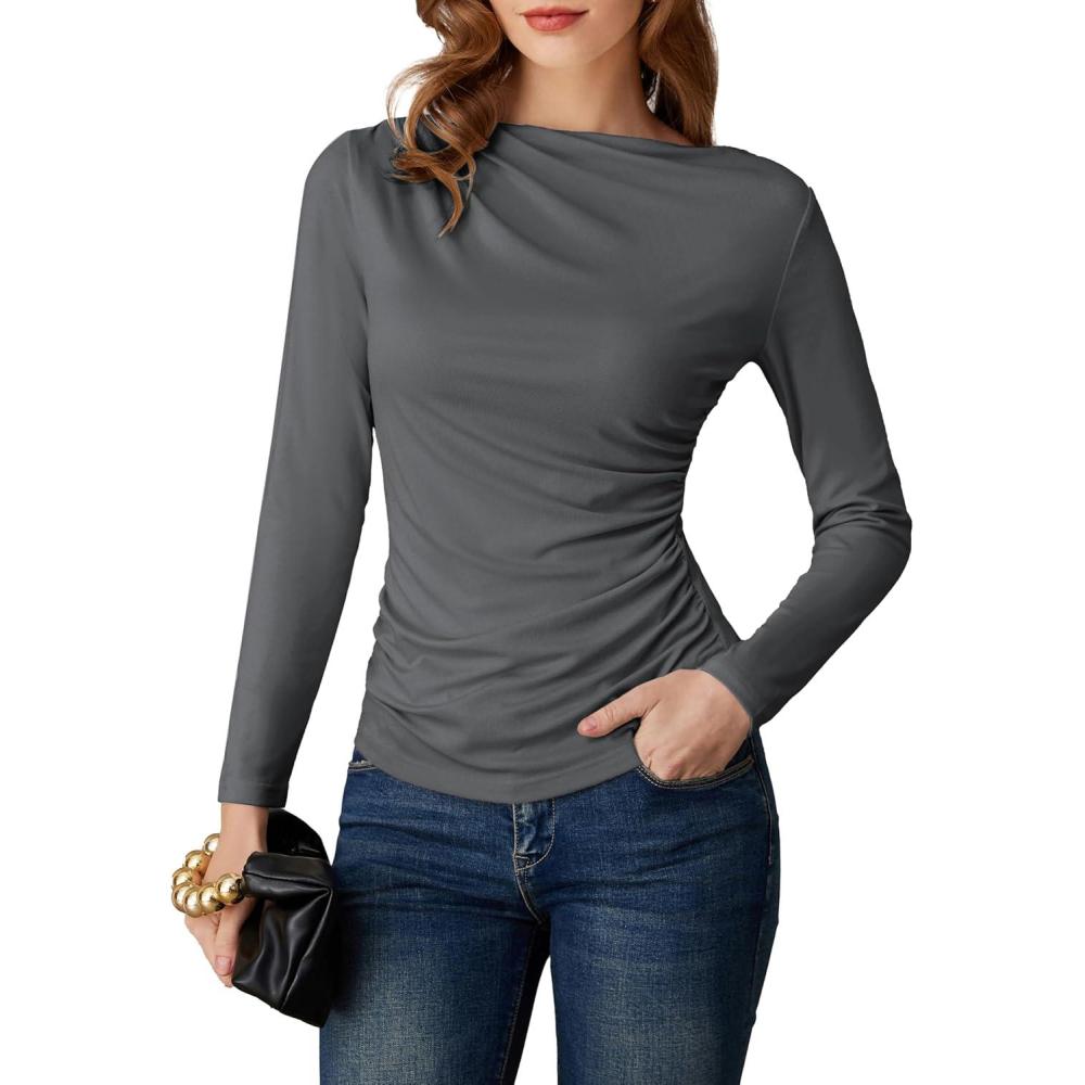 GRACE KARIN 2026 Women’s Long Sleeve Wrap Blouse – Boat Neck Ruched Fitted Trendy Top for Fall Dressy Casual(Gray)