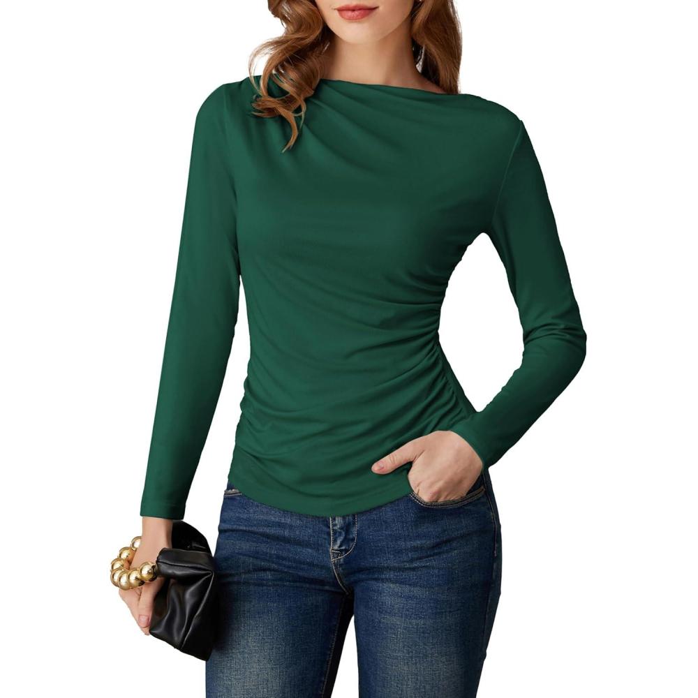 GRACE KARIN 2026 Women’s Long Sleeve Wrap Blouse – Boat Neck Ruched Fitted Trendy Top for Fall Dressy Casual(Green)
