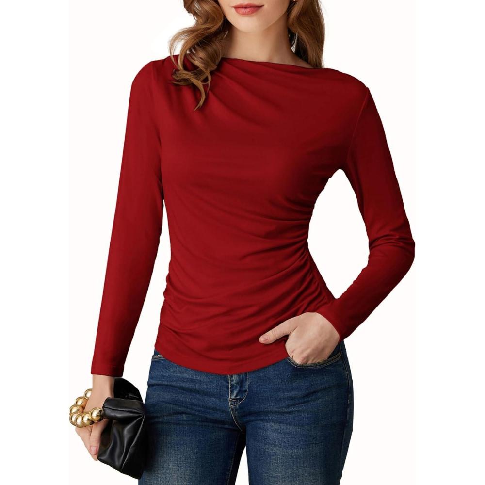 GRACE KARIN 2026 Women’s Long Sleeve Wrap Blouse – Boat Neck Ruched Fitted Trendy Top for Fall Dressy Casual(Red)