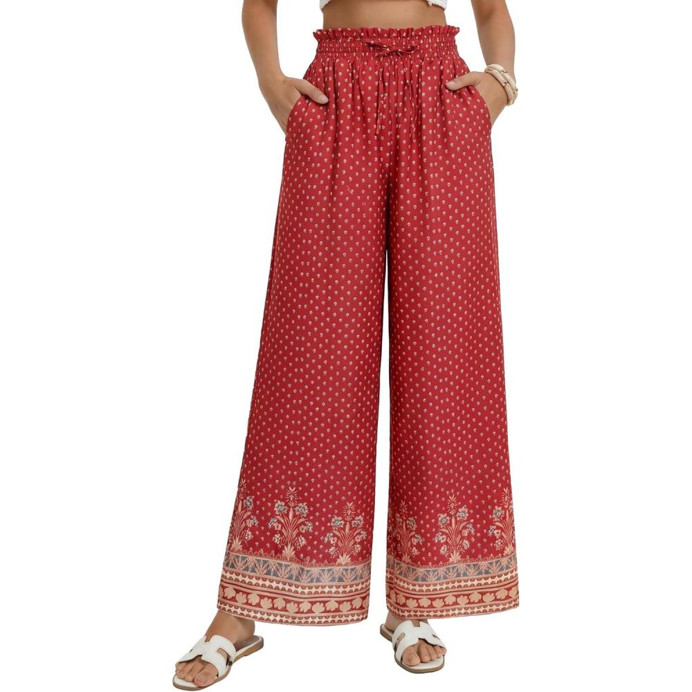 GRACE KARIN Palazzo Pants for Women, Ruffle Drawstring Flowy Trousers with Pockets, Beach Vacation Casual Boho Outfits(Red Bohemian)