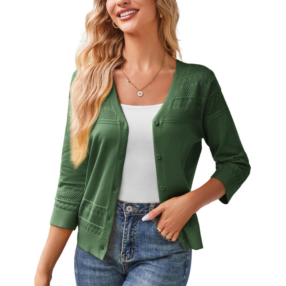 GRACE KARIN Women’s 2025 Cropped Cardigan 3/4 Sleeve Lightweight Crochet Shrug Hollowed-Out Knit Sweater Tops(Army Green)