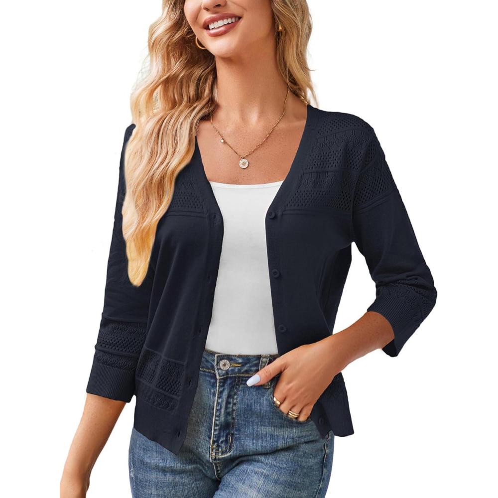 GRACE KARIN Women’s 2025 Cropped Cardigan 3/4 Sleeve Lightweight Crochet Shrug Hollowed-Out Knit Sweater Tops(Dark Blue)