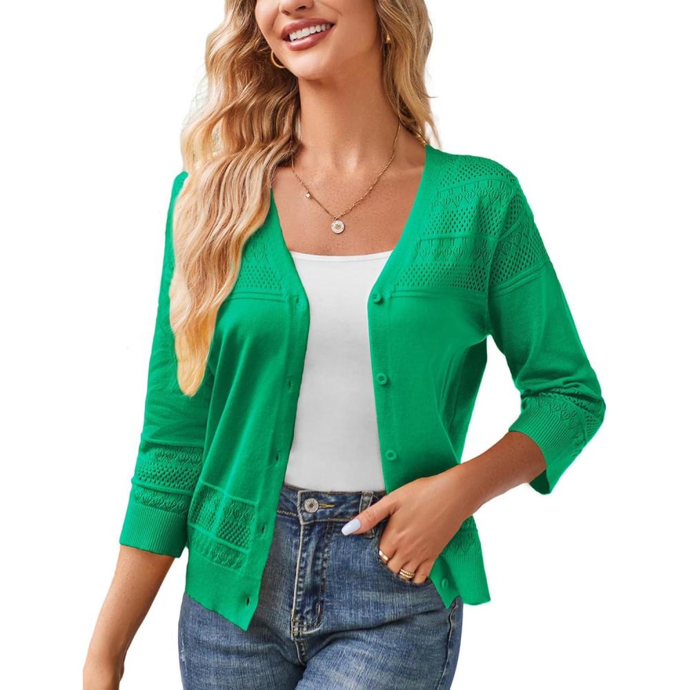 GRACE KARIN Women’s 2025 Cropped Cardigan 3/4 Sleeve Lightweight Crochet Shrug Hollowed-Out Knit Sweater Tops(Dark Green)