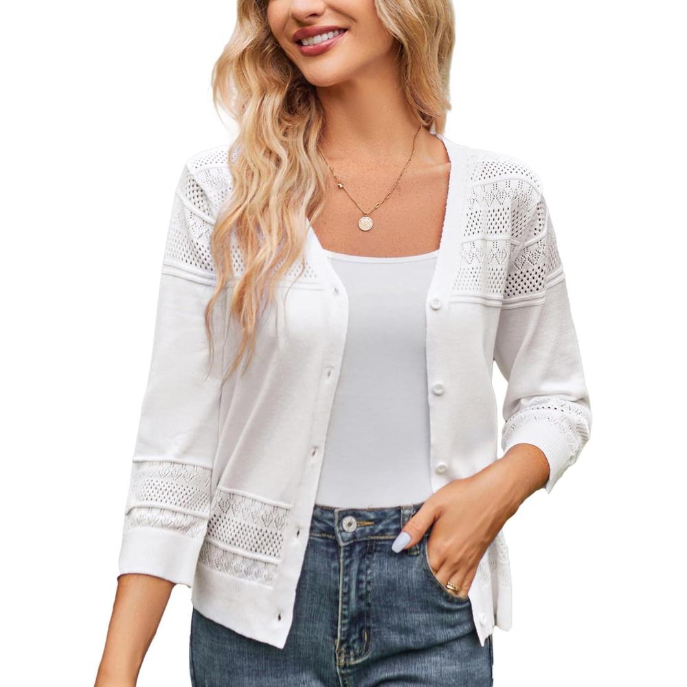 GRACE KARIN Women’s 2025 Cropped Cardigan 3/4 Sleeve Lightweight Crochet Shrug Hollowed-Out Knit Sweater Tops(Bright White)