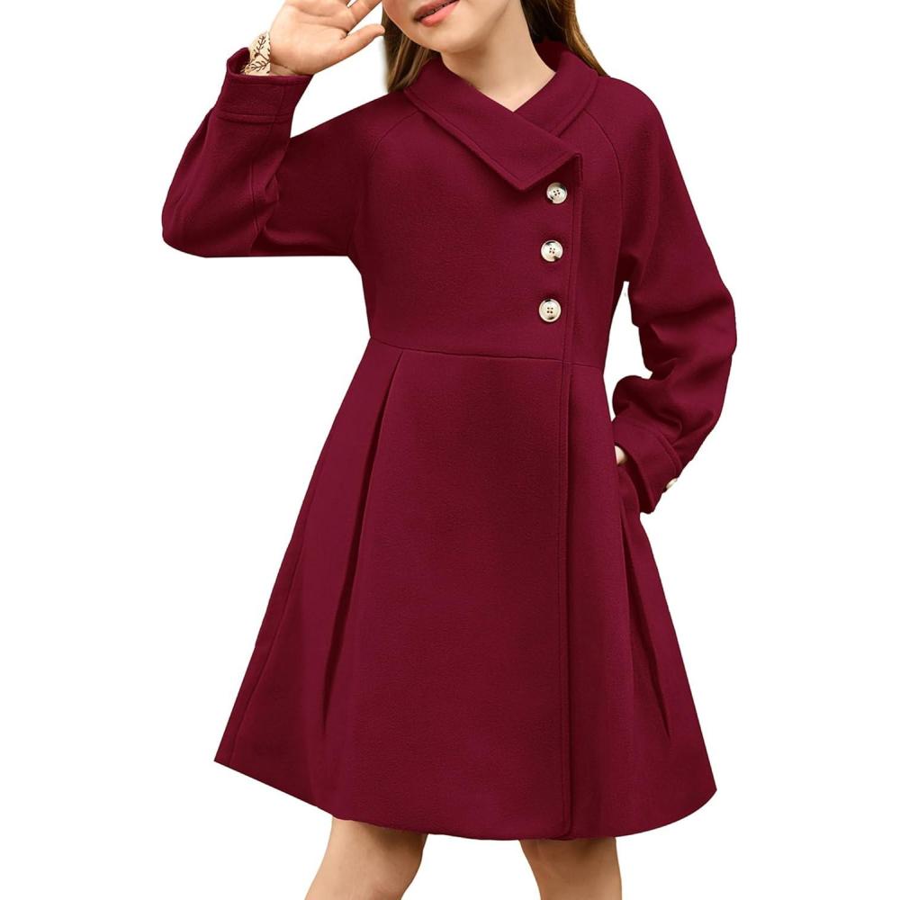 GRACE KARIN Girls Dress Coat Kids Wool Lapel Long Button Jackets Fall Winter Outerwear Peacoat with Pockets 5-12Y(Burgundy)