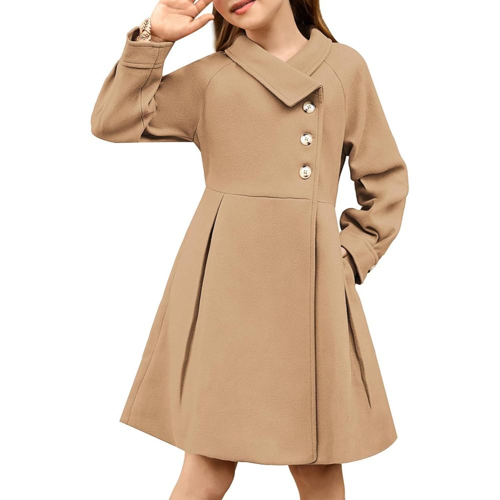 GRACE KARIN Girls Dress Coat Kids Wool Lapel Long Button Jackets Fall Winter Outerwear Peacoat with Pockets 5-12Y(Camel)
