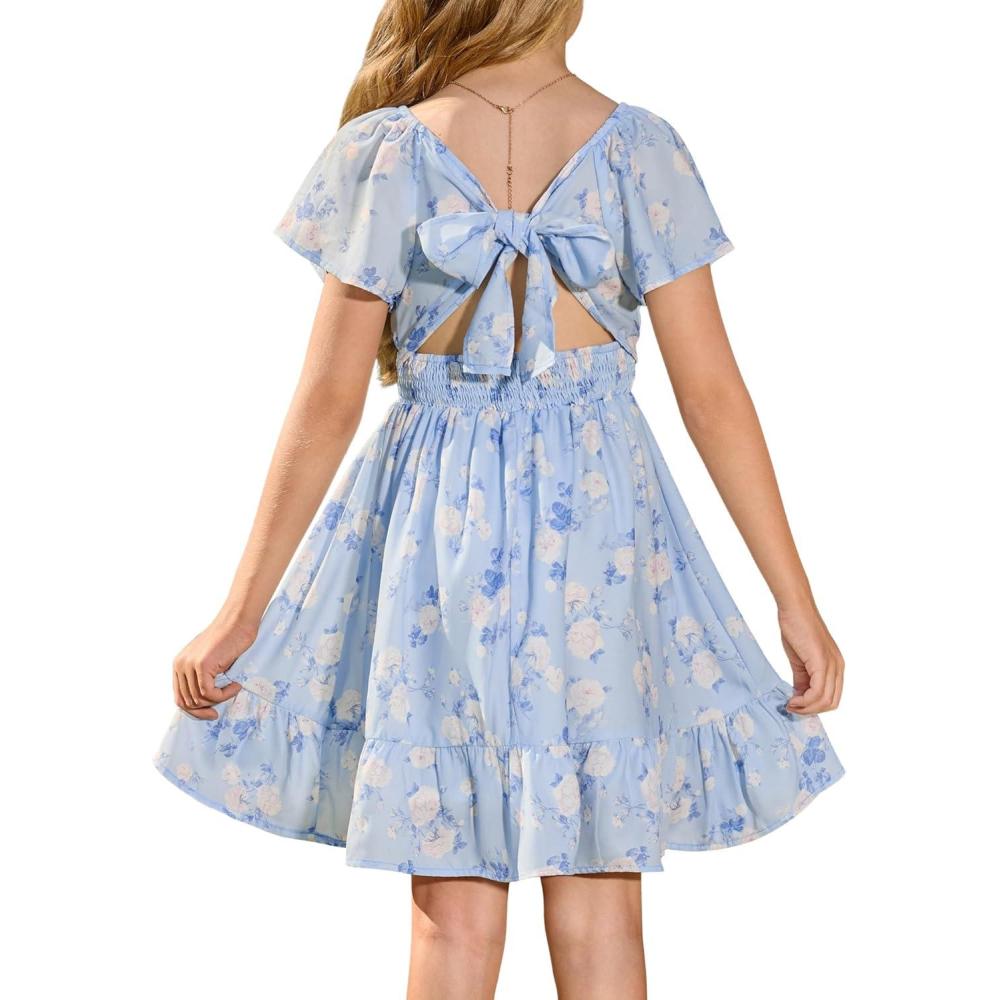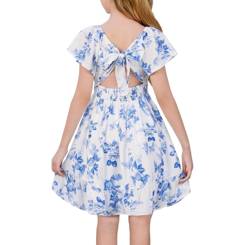 GRACE KARIN Girls Backless Floral Dress Formal Party Girls Easter Spring Dresses Girl Summer Hawaiian Dress(White Blue Floral)