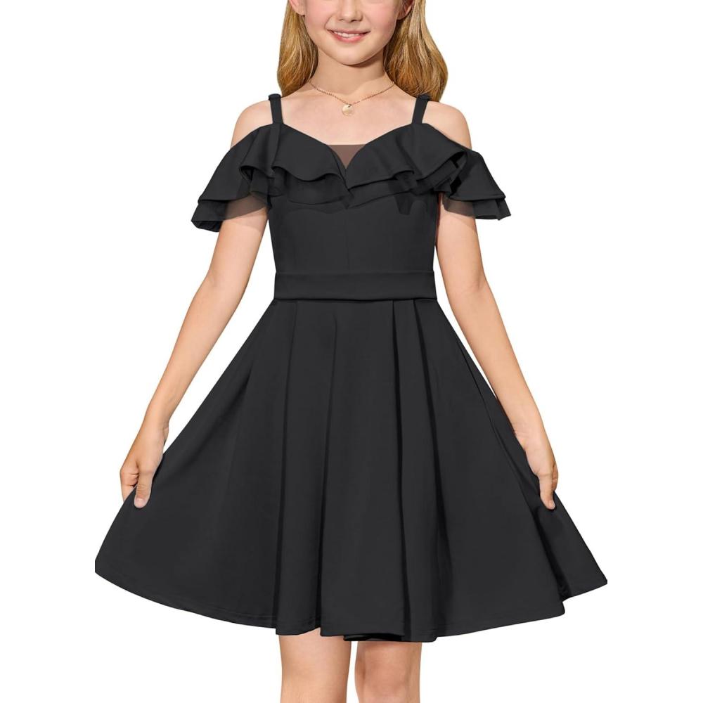 GRACE KARIN Girls Elegant Party Dress Cold Shoulder Ruffled Neckline High Waist A-Line Dress for Girls 7-14 Years(Black)