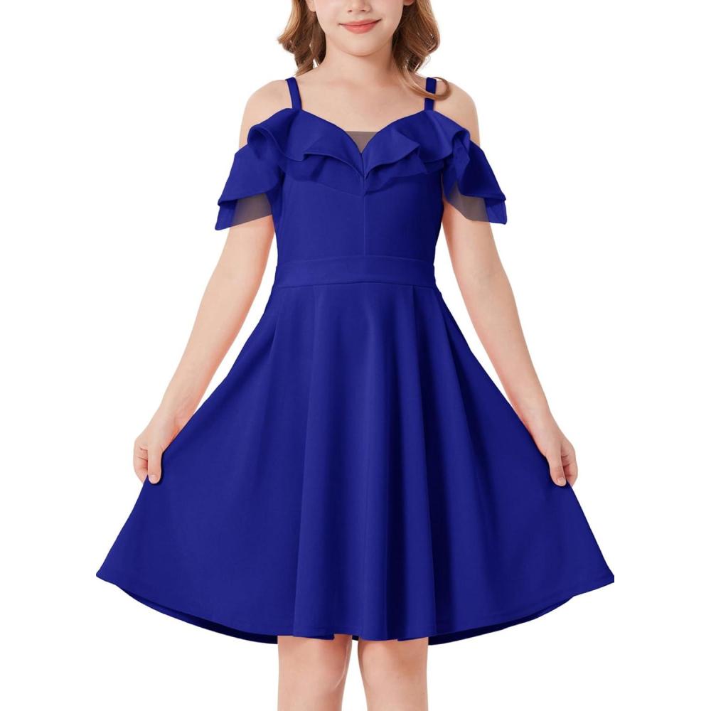GRACE KARIN Girls Elegant Party Dress Cold Shoulder Ruffled Neckline High Waist A-Line Dress for Girls 7-14 Years(Blue)