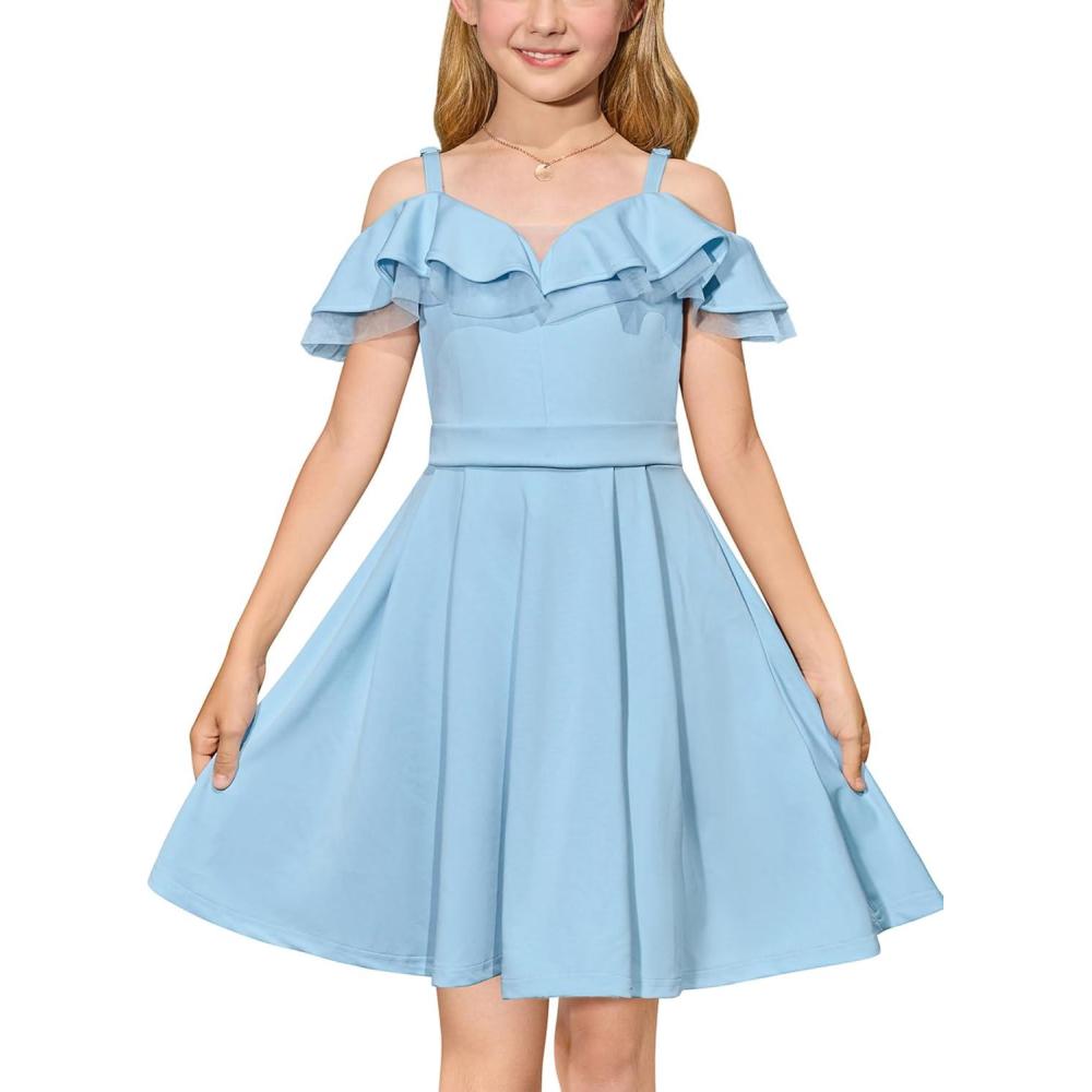 GRACE KARIN Girls Elegant Party Dress Cold Shoulder Ruffled Neckline High Waist A-Line Dress for Girls 7-14 Years(Light Blue)