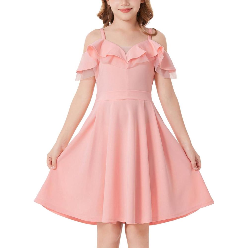 GRACE KARIN Girls Elegant Party Dress Cold Shoulder Ruffled Neckline High Waist A-Line Dress for Girls 7-14 Years(Pink)