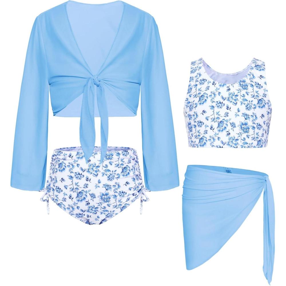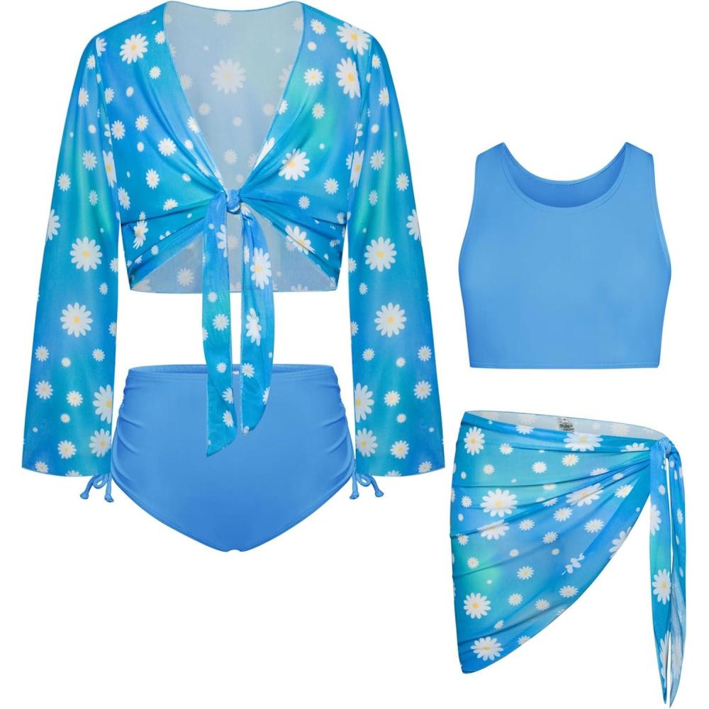 GRACE KARIN Girls Bathing Suit Adjustable Taniki Swimsuit Tie Front 4 Piece Bikini Set with Kimono Cover Up 6-14(Green Blue-daisy)