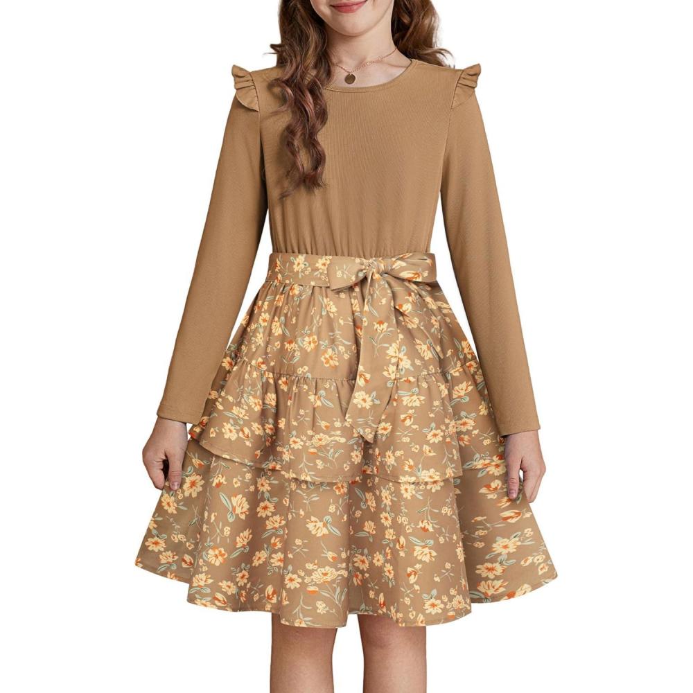 GRACE KARIN Girls Fall Long Sleeve Dresses Girl Floral Midi Dress Kids Casual Holiday Dresses with Belt Size 6-13(Brown Floral)
