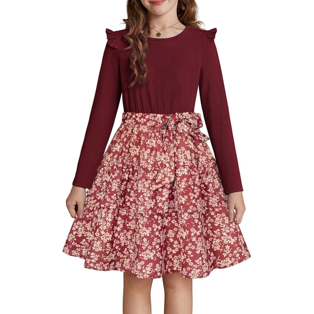 GRACE KARIN Girls Fall Long Sleeve Dresses Girl Floral Midi Dress Kids Casual Holiday Dresses with Belt Size 6-13(Burgundy Floral)