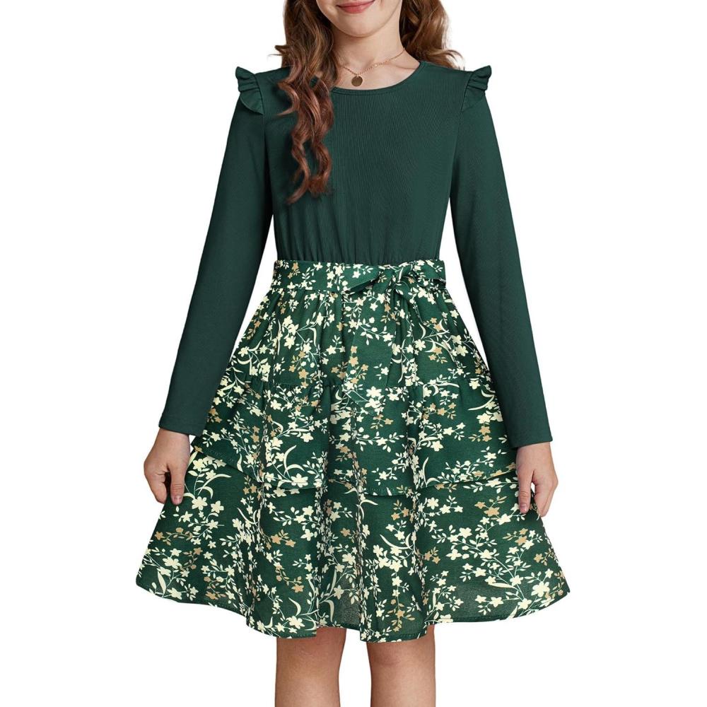 GRACE KARIN Girls Fall Long Sleeve Dresses Girl Floral Midi Dress Kids Casual Holiday Dresses with Belt Size 6-13(Emerald Green Floral)