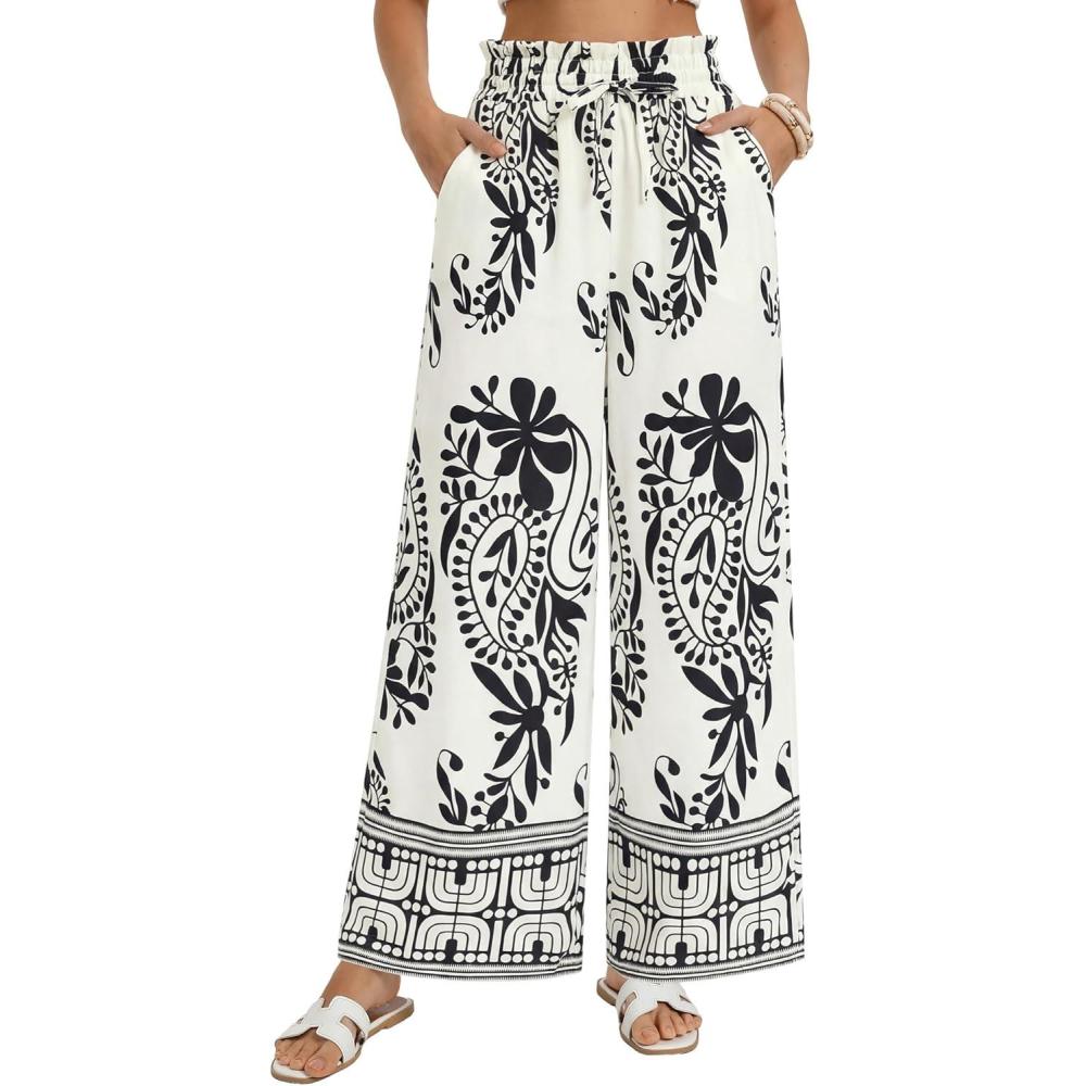 GRACE KARIN Palazzo Pants for Women, Ruffle Drawstring Flowy Trousers with Pockets, Beach Vacation Casual Boho Outfits(Black White Floral)