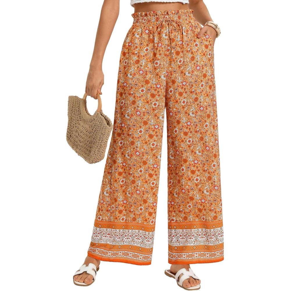 GRACE KARIN Palazzo Pants for Women, Ruffle Drawstring Flowy Trousers with Pockets, Beach Vacation Casual Boho Outfits(Orange Floral)