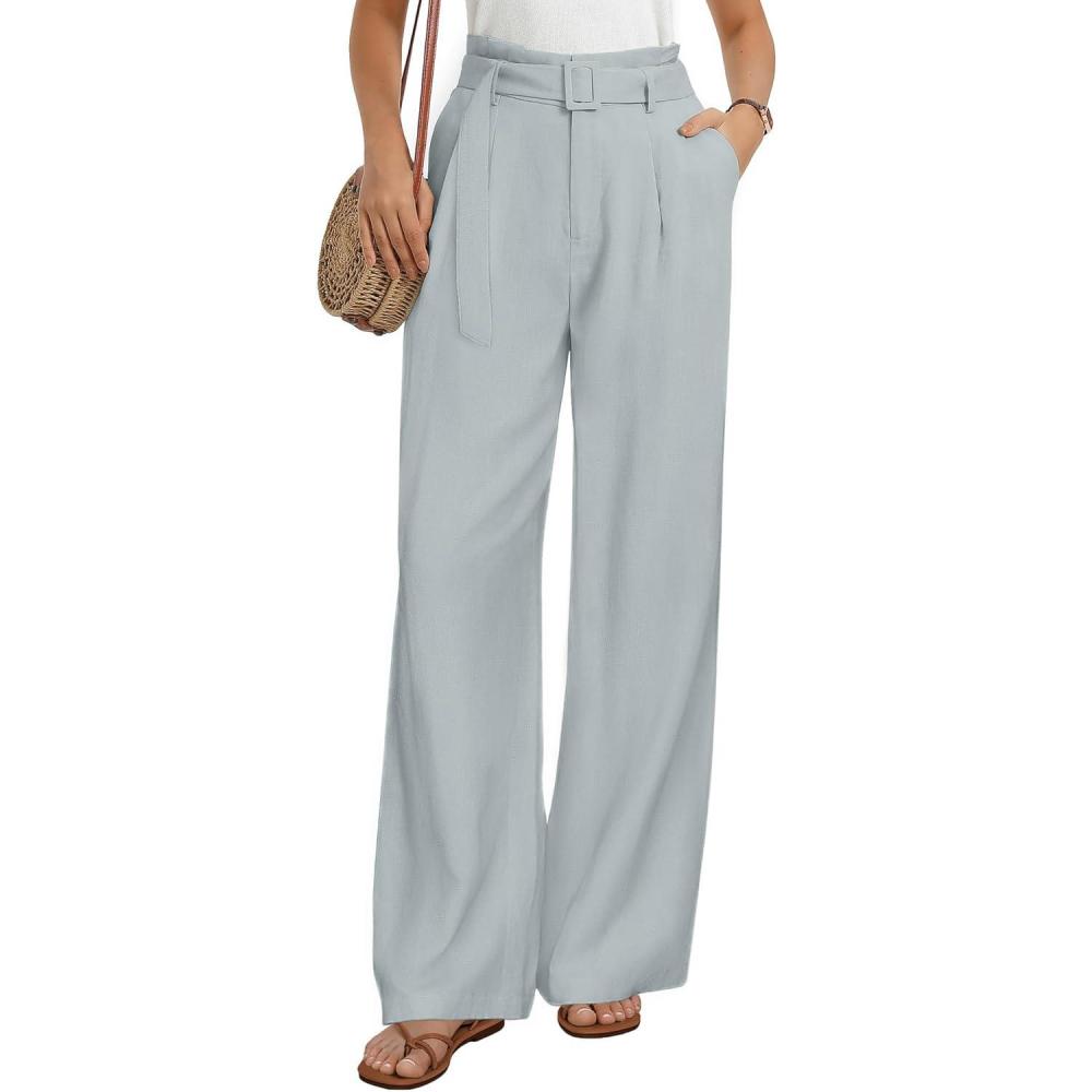 GRACE KARIN Linen Pants Women, Wide Leg High Waisted Palazzo Trousers with Pockets, Business Casual Outfits(Light Grey Blue)