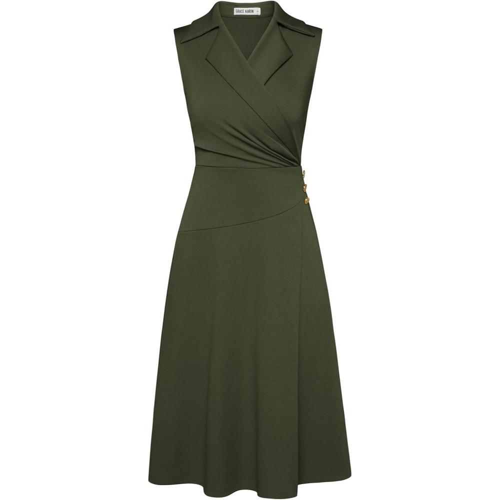 GRACE KARIN 2025 Women’s Notch Lapel Ruched Wrap V Neck Business Work Dress Sleeveless A Line Midi Dress(Army Green)