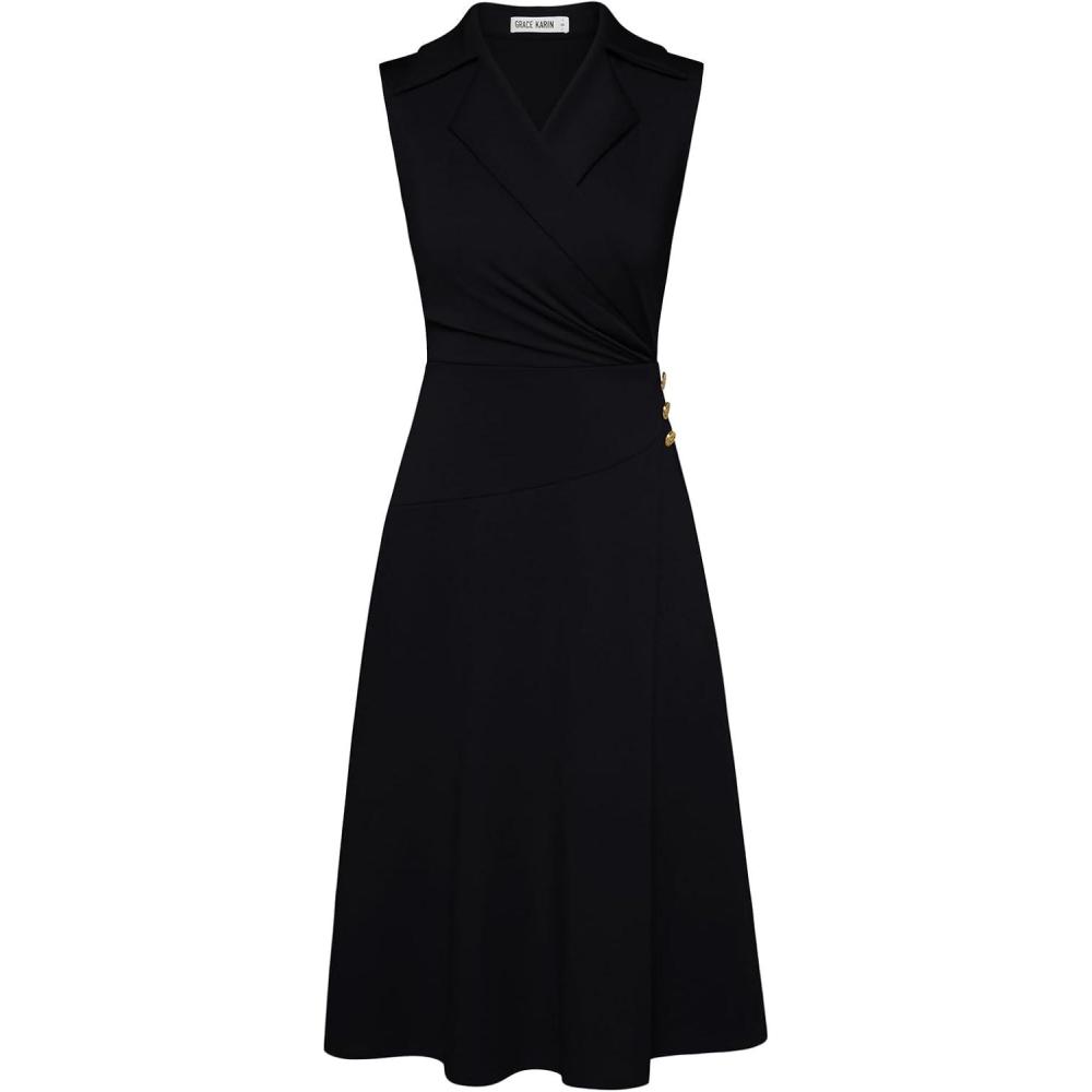 GRACE KARIN 2025 Women’s Notch Lapel Ruched Wrap V Neck Business Work Dress Sleeveless A Line Midi Dress(Black)
