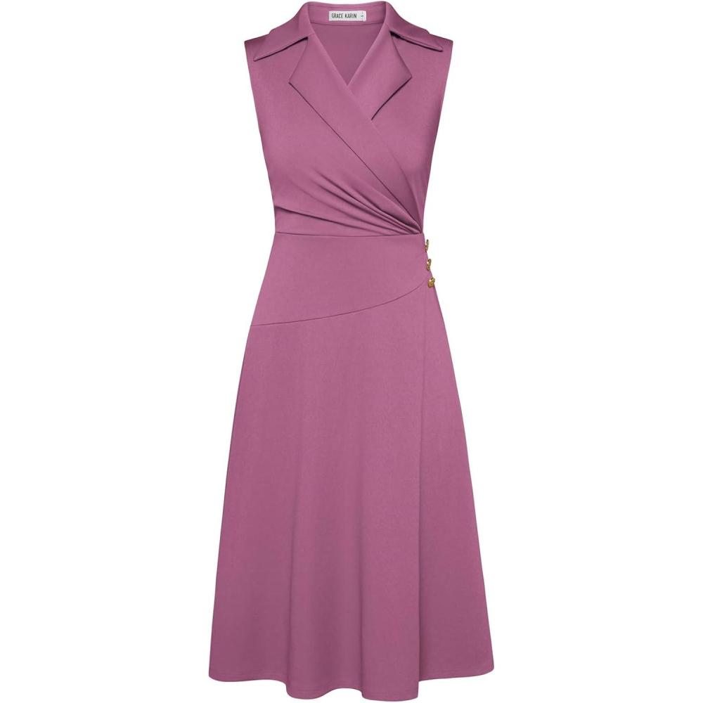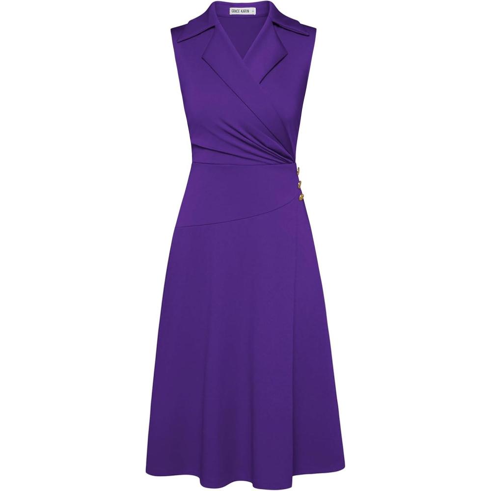 GRACE KARIN 2025 Women’s Notch Lapel Ruched Wrap V Neck Business Work Dress Sleeveless A Line Midi Dress(Purple)