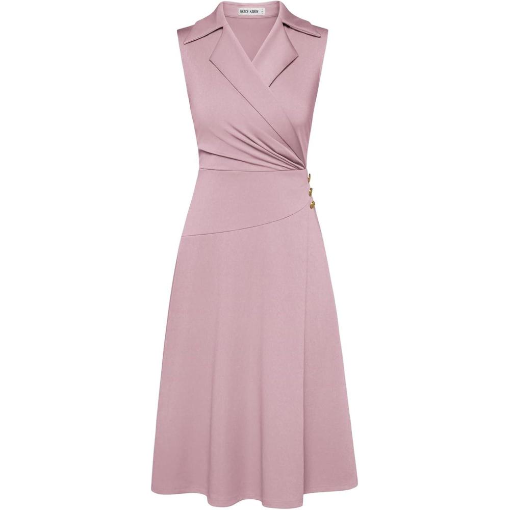 GRACE KARIN 2025 Women’s Notch Lapel Ruched Wrap V Neck Business Work Dress Sleeveless A Line Midi Dress(Light Pink)