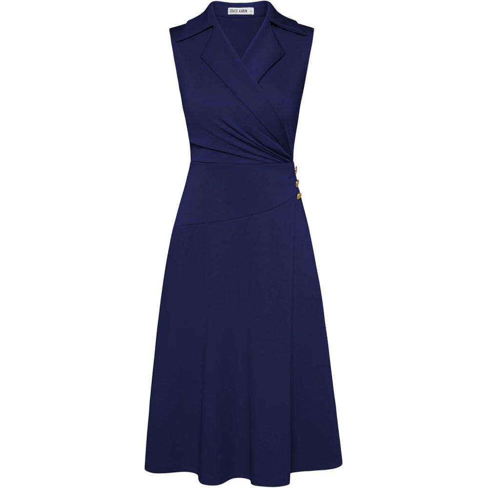 GRACE KARIN 2025 Women’s Notch Lapel Ruched Wrap V Neck Business Work Dress Sleeveless A Line Midi Dress(Navy Blue)