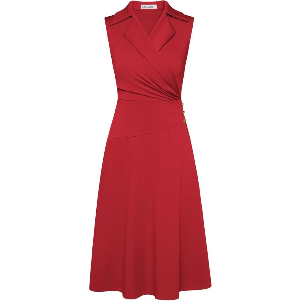 GRACE KARIN 2025 Women’s Notch Lapel Ruched Wrap V Neck Business Work Dress Sleeveless A Line Midi Dress(Red)