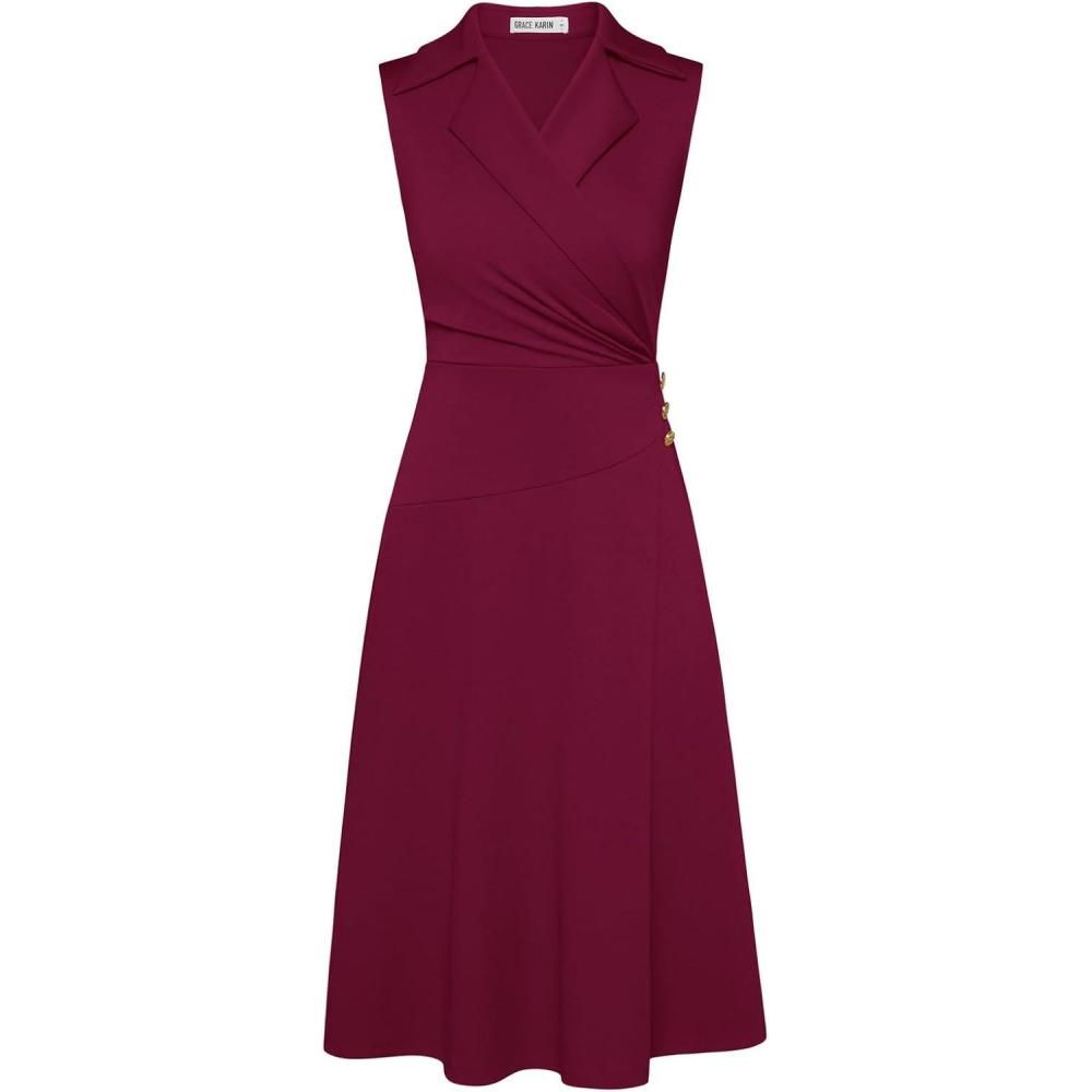 GRACE KARIN 2025 Women’s Notch Lapel Ruched Wrap V Neck Business Work Dress Sleeveless A Line Midi Dress(Wine Red)