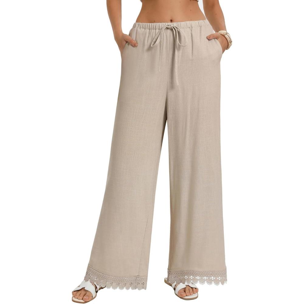 GRACE KARIN Women Linen Pants Wide Leg Casual Palazzo Pants Flowy Beach Summer Trousers Pants with Pockets(Apricot)