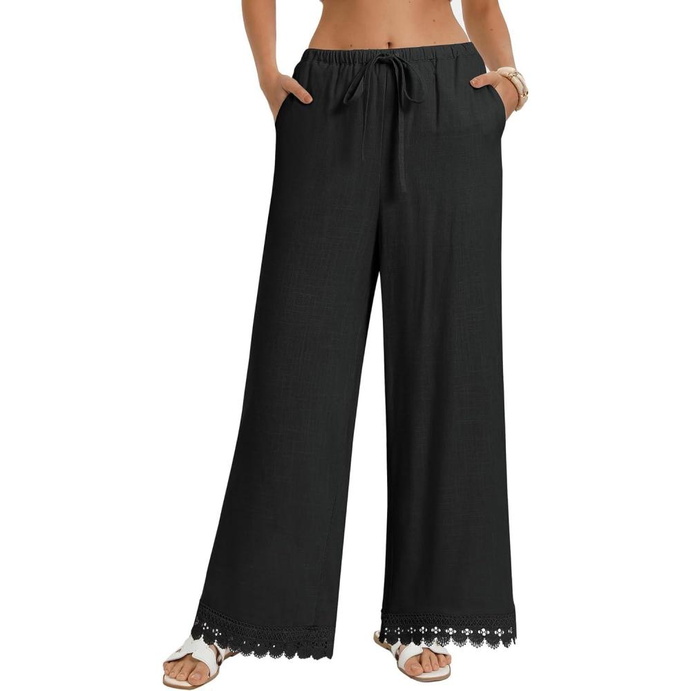GRACE KARIN Women Linen Pants Wide Leg Casual Palazzo Pants Flowy Beach Summer Trousers Pants with Pockets(Black)