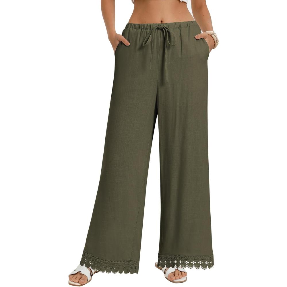 GRACE KARIN Women Linen Pants Wide Leg Casual Palazzo Pants Flowy Beach Summer Trousers Pants with Pockets(Green)