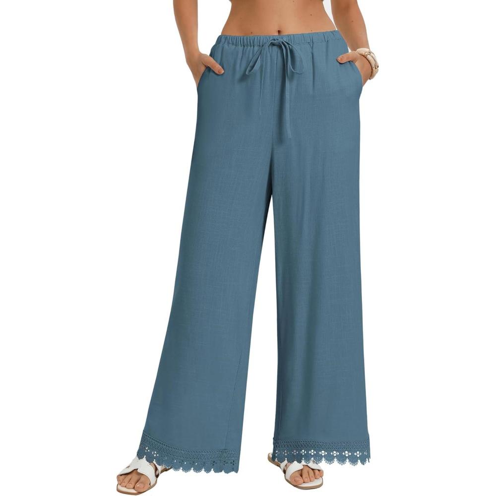 GRACE KARIN Women Linen Pants Wide Leg Casual Palazzo Pants Flowy Beach Summer Trousers Pants with Pockets(Grey Blue)