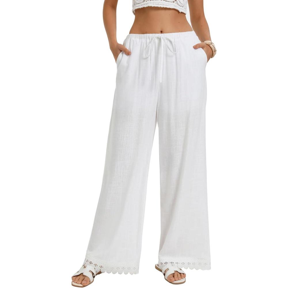 GRACE KARIN Women Linen Pants Wide Leg Casual Palazzo Pants Flowy Beach Summer Trousers Pants with Pockets(White)