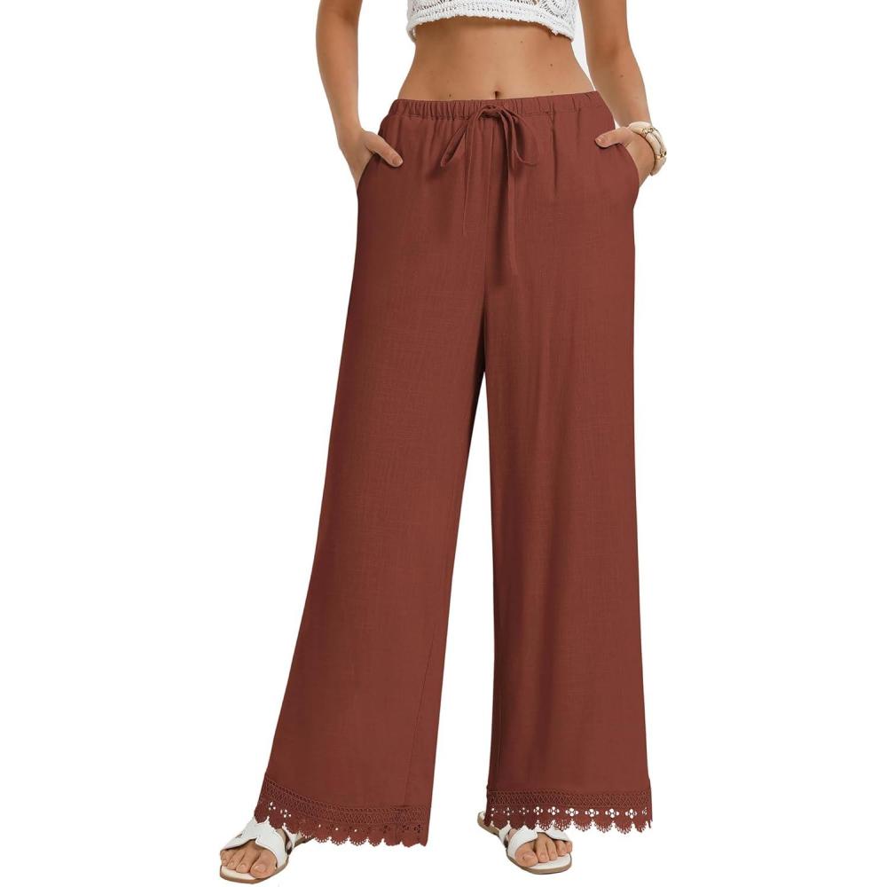 GRACE KARIN Women Linen Pants Wide Leg Casual Palazzo Pants Flowy Beach Summer Trousers Pants with Pockets(Brick Red)