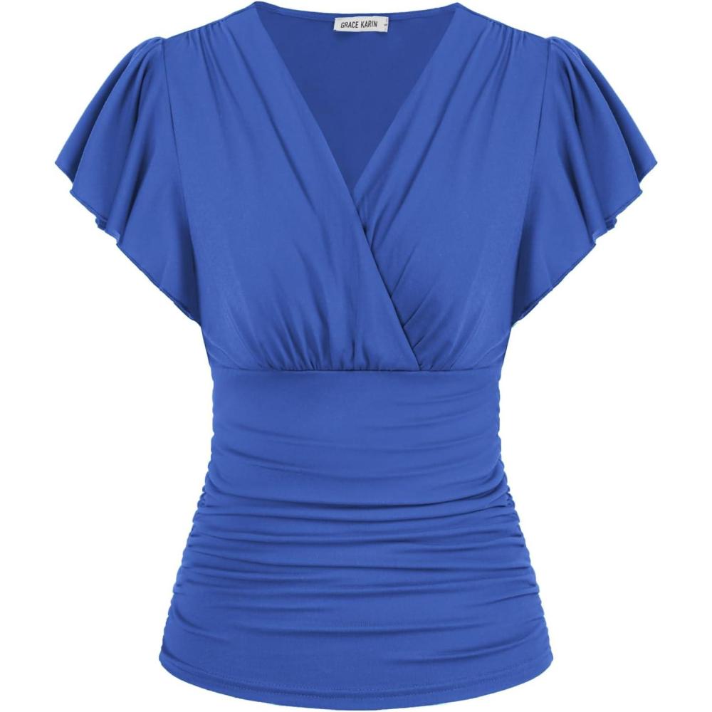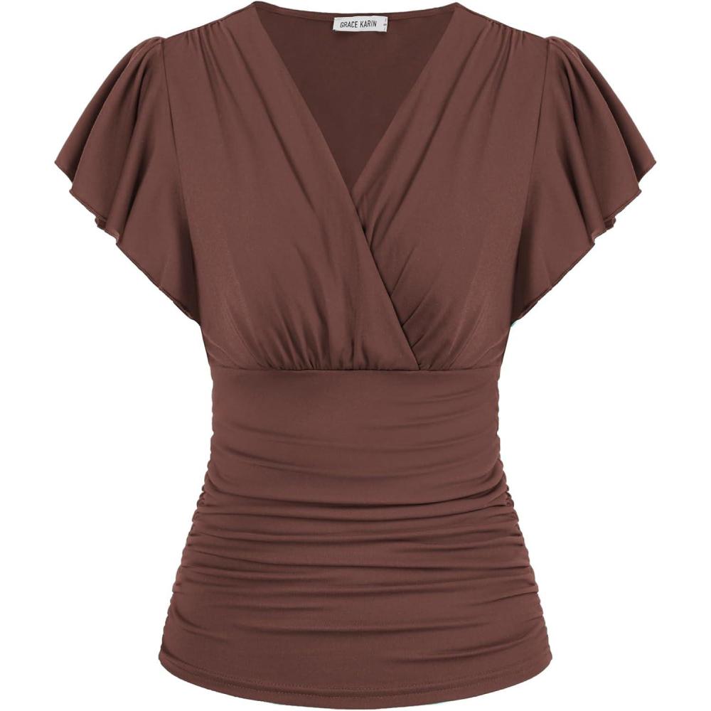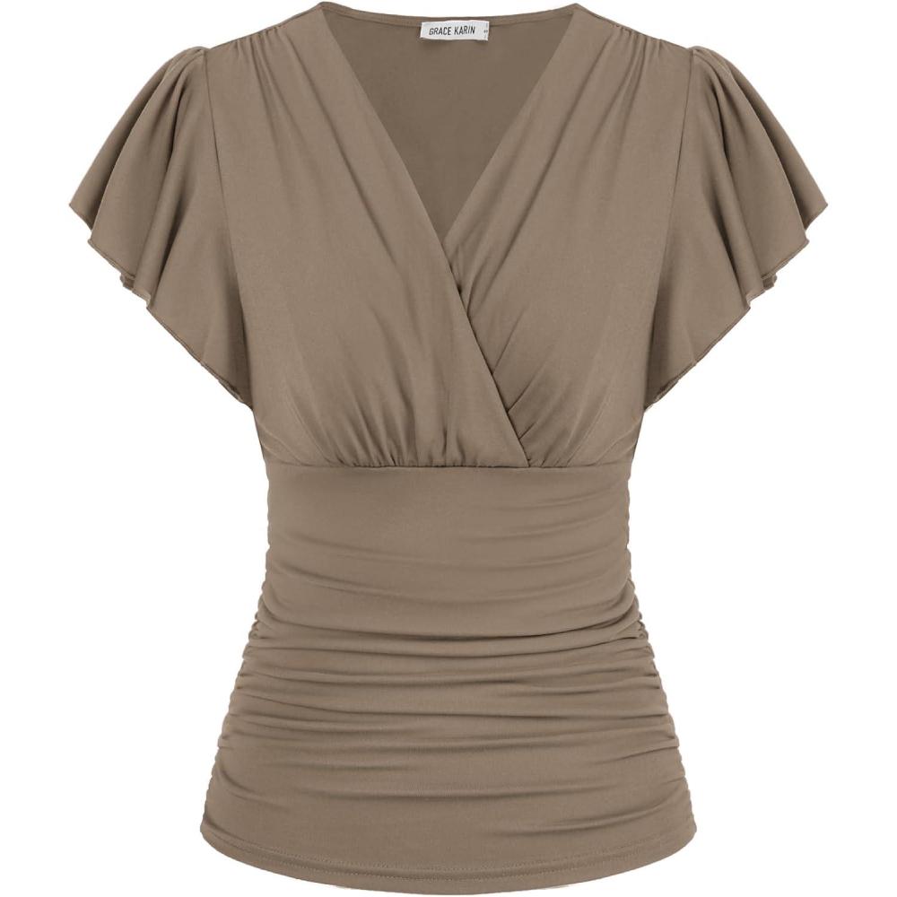 GRACE KARIN 2025 Womens Tops Summer Wrap Blouse V Neck Ruffle Sleeve Dressy Casual Top Ruched Trendy Clothes(Light Pink)